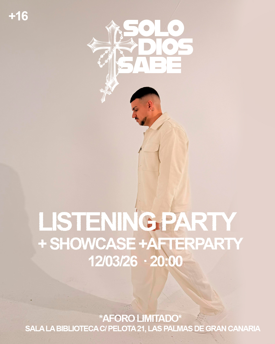 SOLO DIOS SABE: El artista canario Wos LasPalmas regresa para presentar su proyecto más ambicioso hasta la fecha: "SÓLO DIOS SABE". En una noche diseñada para los verdaderos seguidores de su sonido, esta noche testigo de un evento dividido en tres actos que van más allá de un simple concierto. • Listening Party: Una oportunidad única para sumergirse en la atmósfera de su nuevo álbum. Los asistentes podrán escuchar el disco completo, de principio a fin, antes de su llegada a plataformas digitales, compartiendo las historias y secretos detrás de cada track. • Showcase: Wos LasPalmas subirá al escenario para defender en vivo los temas más potentes de esta nueva era, con una puesta en escena cargada de la energía y autenticidad que lo caracteriza. • Afterparty: La celebración no termina con el show. La noche se cierra con una fiesta exclusiva donde el ritmo no para, permitiendo a los asistentes celebrar el lanzamiento junto al artista e invitados en un ambiente distendido.