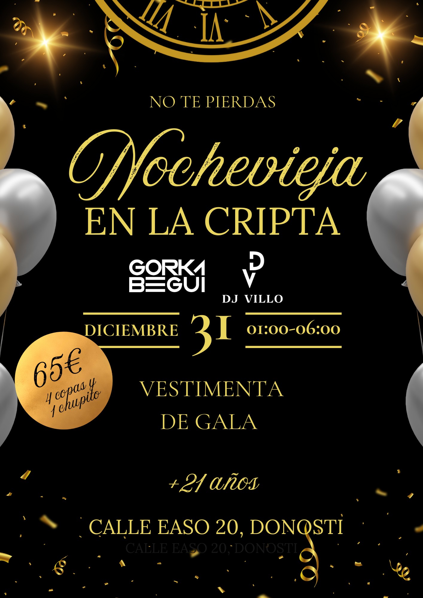 ¡Una noche para empezar el año por todo lo alto! 🎊🥂 Gala de Nochevieja de 01:00 a 06:00. Entrada 65€ con 4 copas y 1 chupito. Descarga tu entrada, enséñala en puerta junto a tu documento de identidad y te pondremos la pulsera con tus consumiciones. Prepárate para una fiesta épica de la mano de Gorka Begui y DJ VIllo.🥳✨