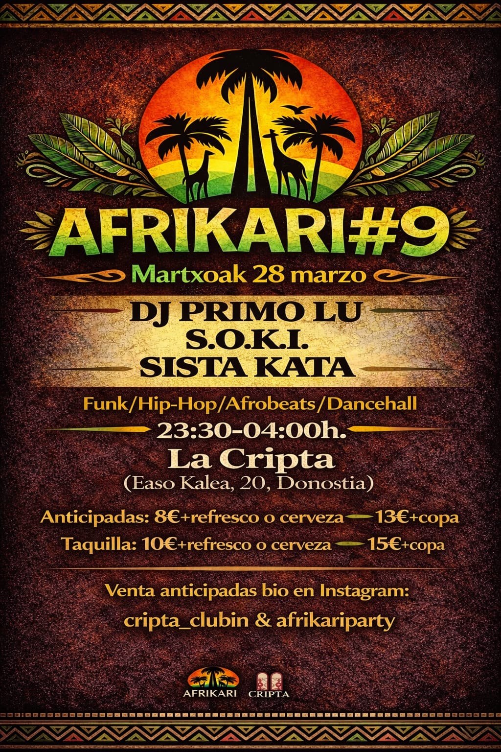 Afrikari se traslada por primera vez a Donostia!En esta edición Afrikari#9 contaremos con Dj Primo Lu como invitado especial que nos visita desde Madrid, y a S.o.k.i y Sista Kata desde Irun para poneros a bailar a ritmo de Funk/Hip-Hop/Afrobeats y Dancehall. Si quieres buena música y buen rollo esta es tu fiesta!Os esperamos!