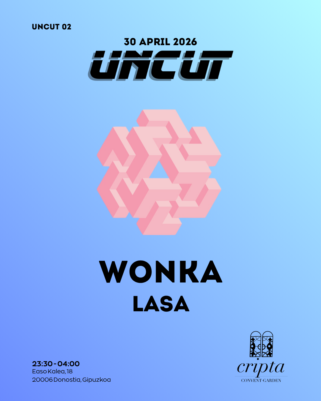 UNCUT 02 Uncut esta de vuelta para haceros vibrar una vez más, esta vez con un invitado muy especial que esta haciendo de las suyas por todos los clubs del norte. Wonka, natural de Bilbao, desprende en cada sesión una energía que seguro no dejará indiferente a nadie. Nuestro residente Lasa será el encargado de dar inicio y cerrar una noche en la que, como siempre, no se guardará nada para que disfrutéis de una noche para recordar. No cuts. No rush.