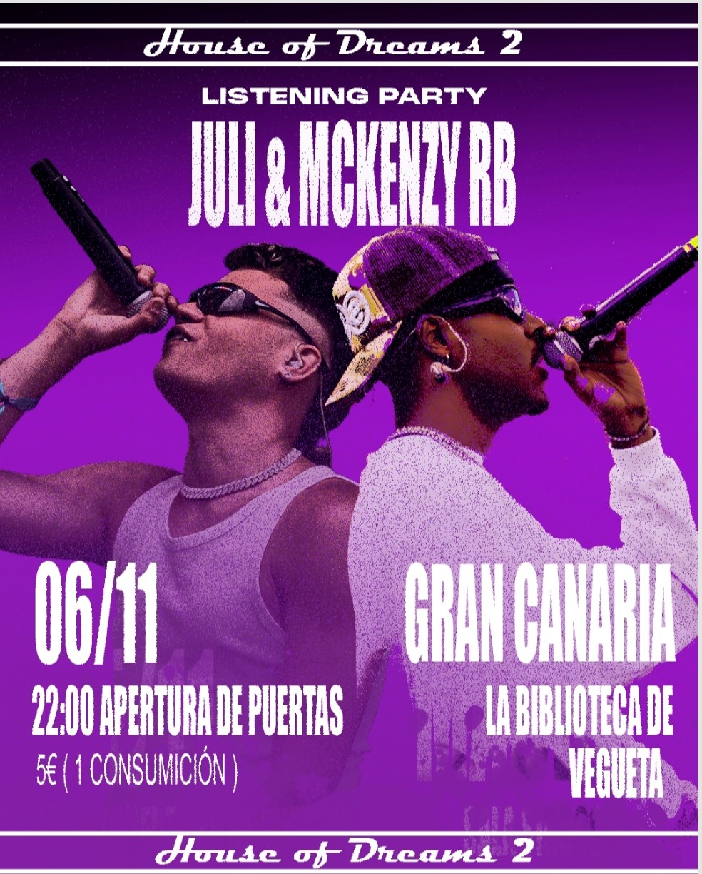 Juli & Mckenzy presentan House of Dreams 2, la esperada continuación de su primera mixtape que los posicionó como una de las promesas más sólidas del reggaetón canario. Tras recorrer España junto a Lucho RK y demostrar su conexión única en directo, el dúo vuelve con nuevos sonidos, más madurez y la misma energía que los caracteriza. Una listening party/show de presentación exclusivo para vivir de cerca el universo de House of Dreams 2 — donde los sueños, el ritmo y la vibra isleña se mezclan en una noche única.