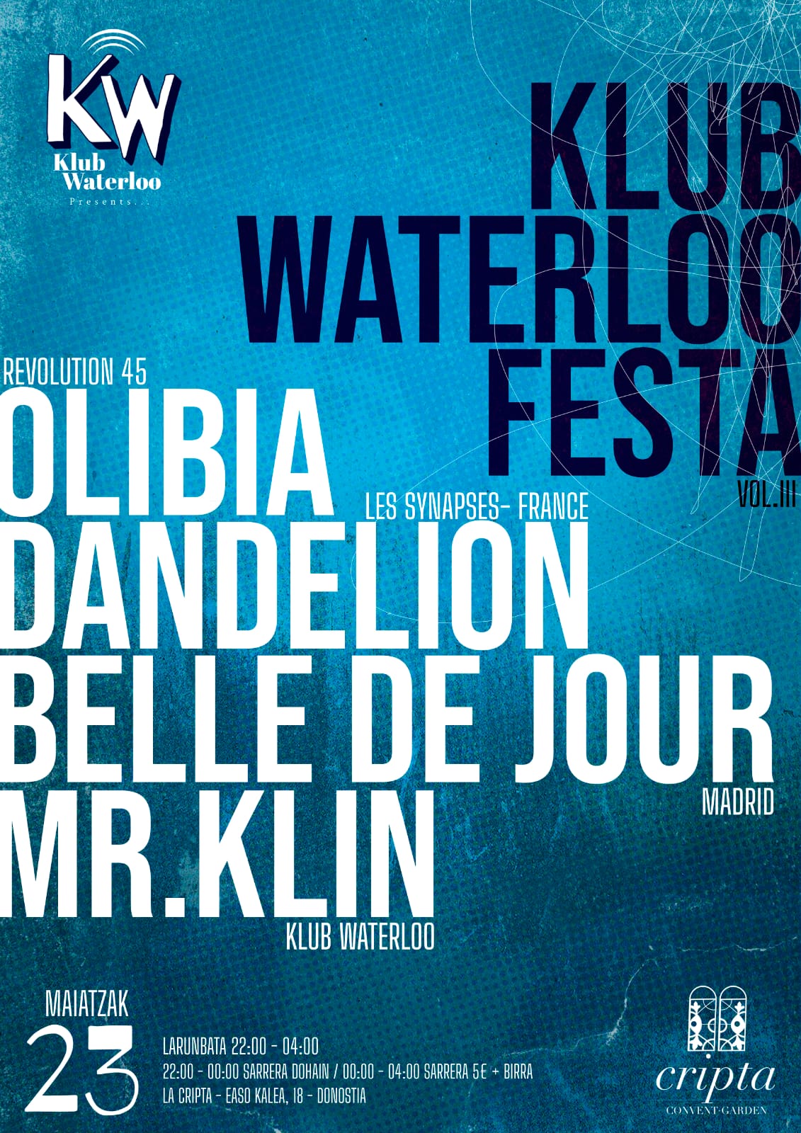 KLUB WATERLOO FESTA VOL III(23 Mayo sábado) ●●●●●●●●●●● Nueva fiesta de Klub Waterloo en La Cripta y para esta tercera edición reunimos a 4 pinchadiscos a 45 revoluciones. Desde Normandía( Francia) nos visita el lider de la banda de Psicodelia 60s Les Synapses,miembro de uno de los mejores weekenders 60s como Mess my mind y uno de los mejores djs de la escena sixties europea.Todo unlujazo tenerlo aquí. Afincada en Madrid la catalana Belle de Jour.Polifacética artista,miembro del flamante duo Filthy Rich, 60s Go-go dancer y una experta dj el panorama estatal. En el ambito local esta vez nos acompañara Olibia,artífice del colectivo Revolution 45 en la capital donostiarra y MR.Klin desde Hendaia organizador y artífice de Klub Waterloo. La fiesta tendrá el horario habitual de 22'00 a 4'00 a.m. Os esperamos en La Cripta el próximo 23 Mayo sábado