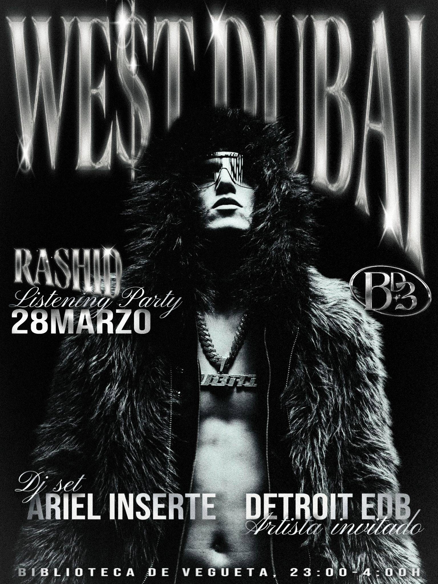 Este 28 de Marzo, vuelve a la isla que lo vio nacer WE$T DUBAI. Después de tener una carrera de ensueño, llegar a todos los rincones del planeta y colaborar con los mejores artistas, vuelve a casa para presentar su proyecto más ambicioso hasta la fecha, RASHID. Listening party, showcase y afterparty de la mano de la mejor fiesta de Gran Canaria, BD3. Además la noche se mantendrá arriba, los mejores dj sets, la actuación de Detroit EDB como artista invitado y muchas sorpresas más. LET’S GO!!!