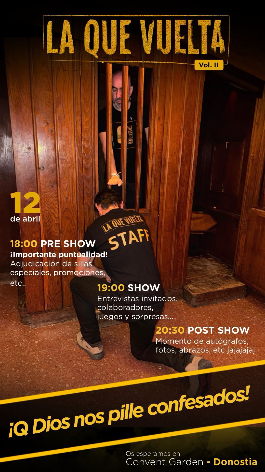 🎙 LA QUE VUELTA – Episodio 2 📅 12 de abril 📍 La Cripta, Convent Garden – Donostia Vuelve La Que Vuelta con su Volumen II, un show en directo presentado por Asier Gato e Isma Mateo, donde el humor, las entrevistas y las sorpresas están garantizadas. La tarde arrancará con un PRE SHOW de 18:00 a 19:00, donde abriremos puertas puntualmente para empezar a calentar el ambiente, repartir algunas sorpresas, gestionar sillas especiales y preparar lo que viene después. A las 19:00 comenzará el SHOW, un formato divertido con entrevistas a invitados, colaboradores, juegos y momentos improvisados. Básicamente somos una especie de “La Revuelta”… pero en versión sin financiación, así que confiamos en que los invitados nos traigan regalos para compensar. Habrá humor, risas y muchas ganas de pasar un buen rato juntos. Y cuando acabe el show… la cosa no termina. A las 20:30 comenzará el POST SHOW, un momento más tranquilo para charlar, sacarnos fotos, firmar autógrafos, tomar algo juntos, escuchar música y compartir.